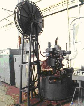 Установка У-877 состоит из наплавочного аппарата, вращающегося стола и смонтированных на нем пяти водоохлаждаемых кокилей, в которые устанавливаются подлежащие наплавке молотки. Наплавка молотков производится в автоматическом режиме с колебаниями электрода на всю ширину наплавляемой детали. На одной установке можно наплавлять 100 - 120 молотков в смену.